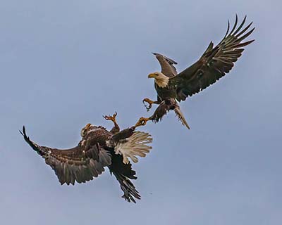These two bald eagles were having a serious territorial discussion. They are both wet because in their first fight both went into the river hooked together. They were too far off and we didn’t have enough lens. There second go at it was equally intense and a tad closer and Lynn captured this photo.